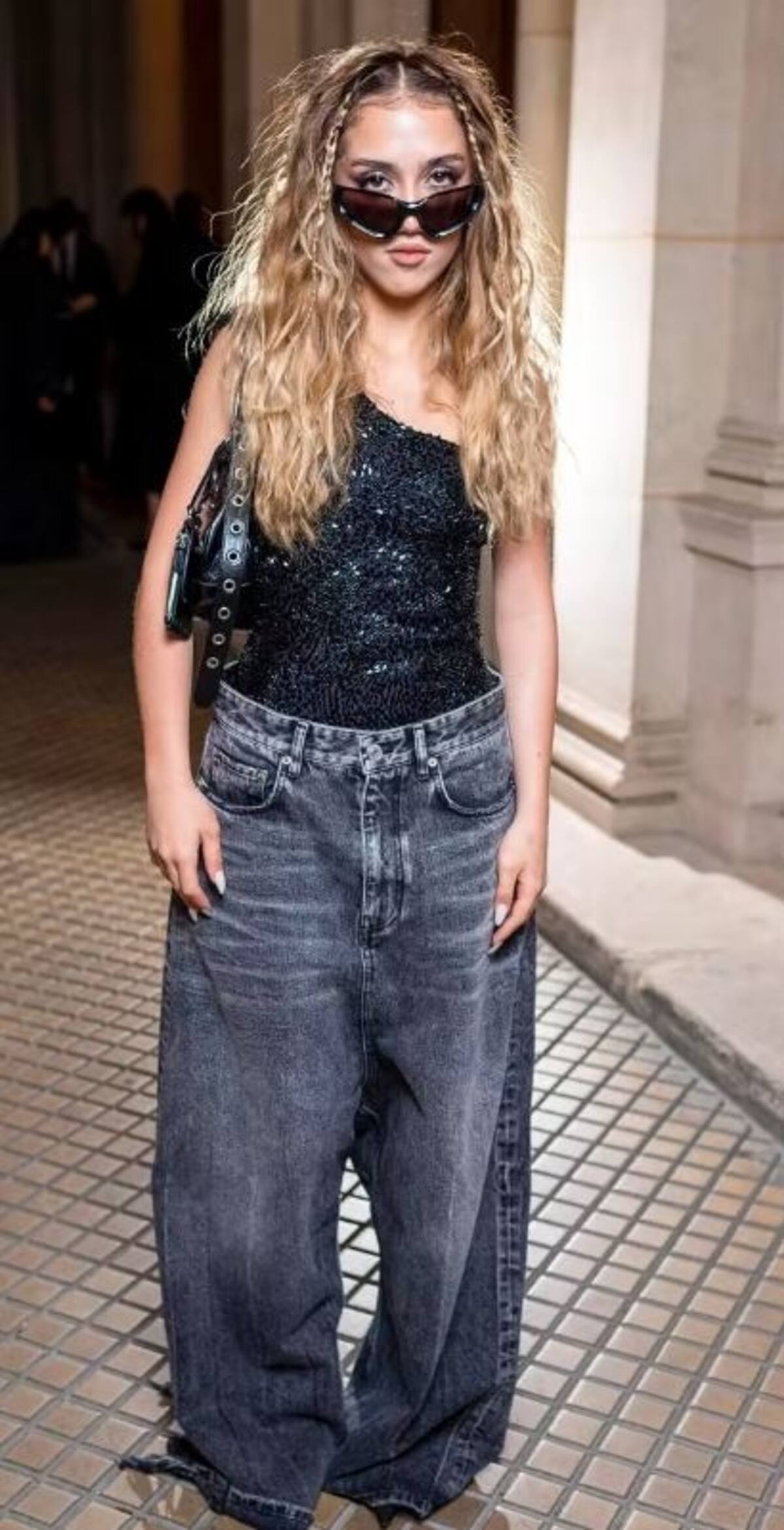 Valentina Paloma eligió un par de baggy jeans con un body asimétrico negro con brillos y un bolso al hombro de la colección Le Cagole de Balenciaga, zapatos negros en puntas y un par de lentes oscuros. Sin duda el toque especial de su outfit fue su cabellera, ya que optó por decolorarla un poco y peinarla en ondas.