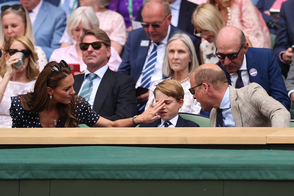 Debido al calor que hacía, George, quien cumplirá nueve años el 22 de julio, fue visto limpiándose la cabeza durante el partido y bebiendo agua en una taza gris; Kate también colocó su mano en la cara de su hijo.