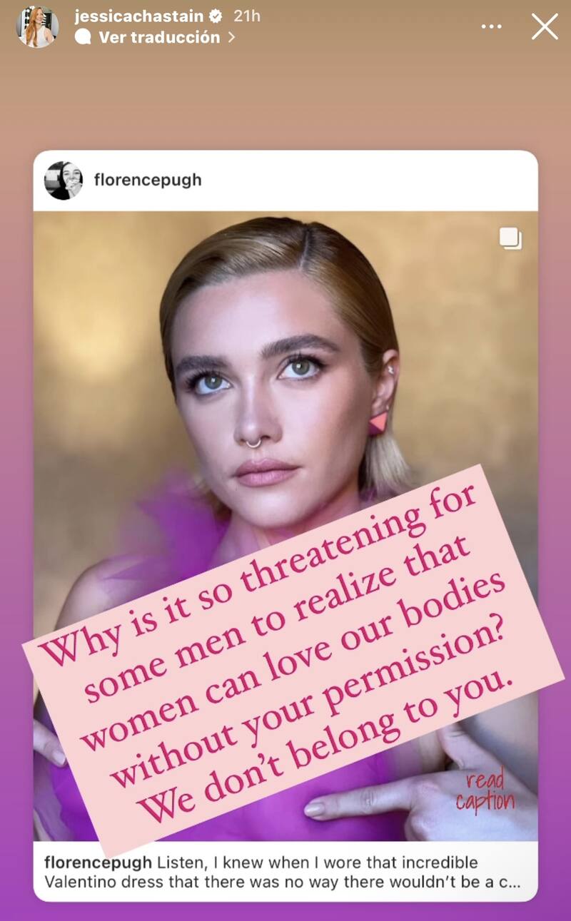 Jessica Chastain muestra su apoyo a Florence Pugh tras las fuertes criticas en su contra y llama a sus haters "hombres vulgares". La actriz y demás compañeros del medio han salido en la defensa de la joven de 26 años.