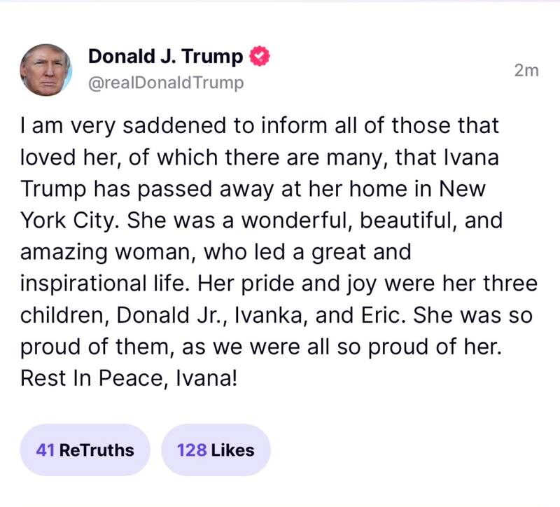 Tras difundirse la noticia Donald Trump, de 76 años, dedicó unas últimas palabras a su exesposa en el portal Truth Social. "Estoy devastado de informarles a todos los que la amaron, que fueron muchos, que Ivana Trump ha fallecido en su hogar en Nueva York", comenzó.