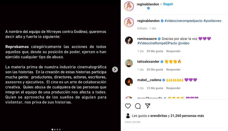 Luego de que el reparto de "Mirreyes contra Godínez 2" subiera ayer un pronunciamiento (en cada una de las cuentas de redes sociales de los intérpretes) en el que reprueba las acciones "de todos aquellos que, desde su posición de poder, ejercen o han ejercido cualquier tipo de abuso", debido a que la actriz Danna Ponce denunciara penalmente al productor Jorge Levy, actrices como Eréndira Ibarra se han sumado al llamado subiendo a sus propias cuentas de redes un pronunciamiento bajo el hashtag Videocine rompe el pacto.