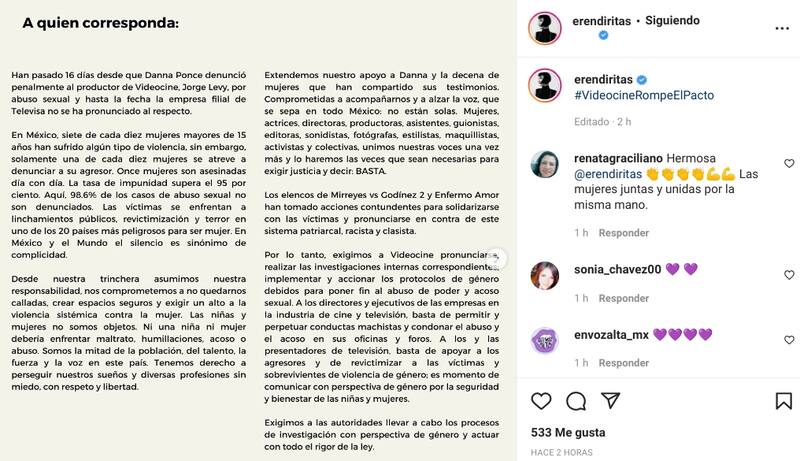 En la misiva se extiende el "apoyo a Danna y la decena de mujeres que han compartido sus testimonios. Comprometidas a acompañarnos y a alzar la voz, que se sepa en todo México: no están solas. Mujeres, actrices, directoras, productoras, asistentes, guionistas, editoras, sonidistas, fotógrafas, estilistas, maquillistas, activistas y colectivas, unimos nuestras voces una vez más y lo haremos las veces que sean necesarias para exigir justicia y decir: BASTA".