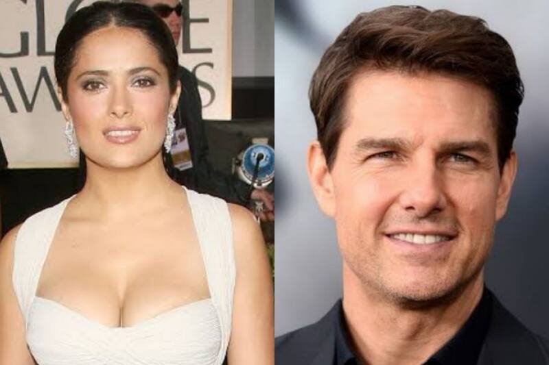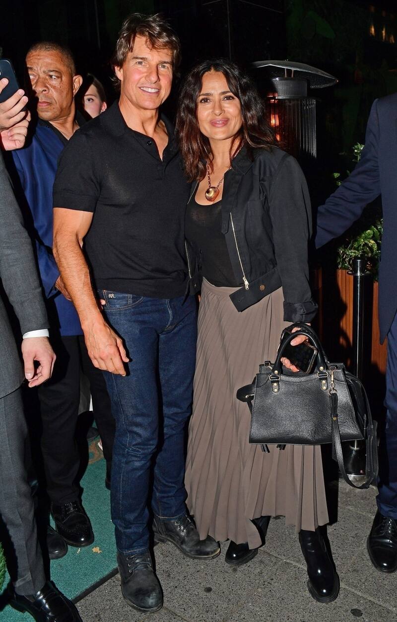 Salma Hayek lució un top transparente negro debajo de su chamarra negra y una falda larga gris, mientras que Tom Cruise llevaba una camiseta negra, pantalones azul oscuro y botas negras.