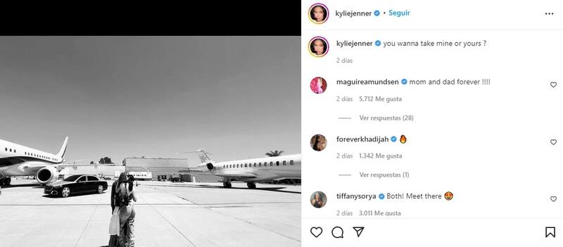 Kylie Jenner compartió una imagen en escala de grises en las que se le puede ver a ella y su pareja, Travis Scott abrazándose juntos a dos jets privados. Básicamente, los aviones era propiedad del cantante y la modelo, por lo que la estrella de telerrealidad acompañó la publicación con el siguiente texto: "¿Quieres usar la mía o la tuya?".