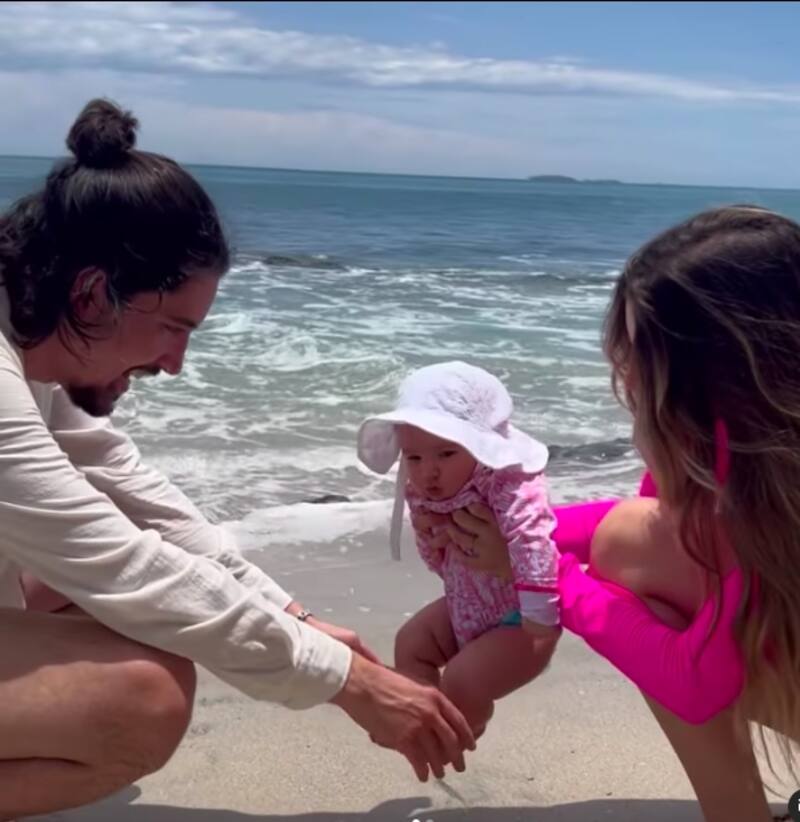 "Cumpliendo 4 meses y conociendo el mar" publicó emocionado como descripción en la publicación de Instagram. Luego que Mía tocó por primera vez con sus pies la arena de la playa y en sus piernas el agua del mar, los orgullosos y felices papás reían de felicidad.