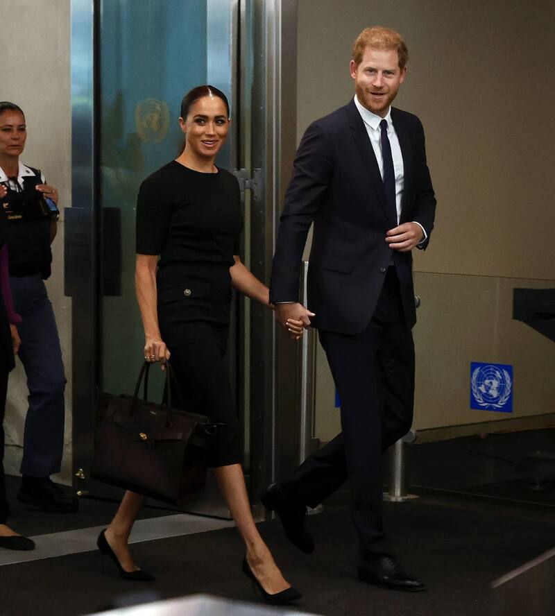 Esta vez la pareja fue fotografiada llegando tomados de las manos a la Asamblea General de Naciones Unidas. El príncipe Harry vistió para la ocasión con un clásico traje y corbata, mientras que la exactriz deslumbró con un elegante vestido negro, mismo que acompañó con accesorio dorados.