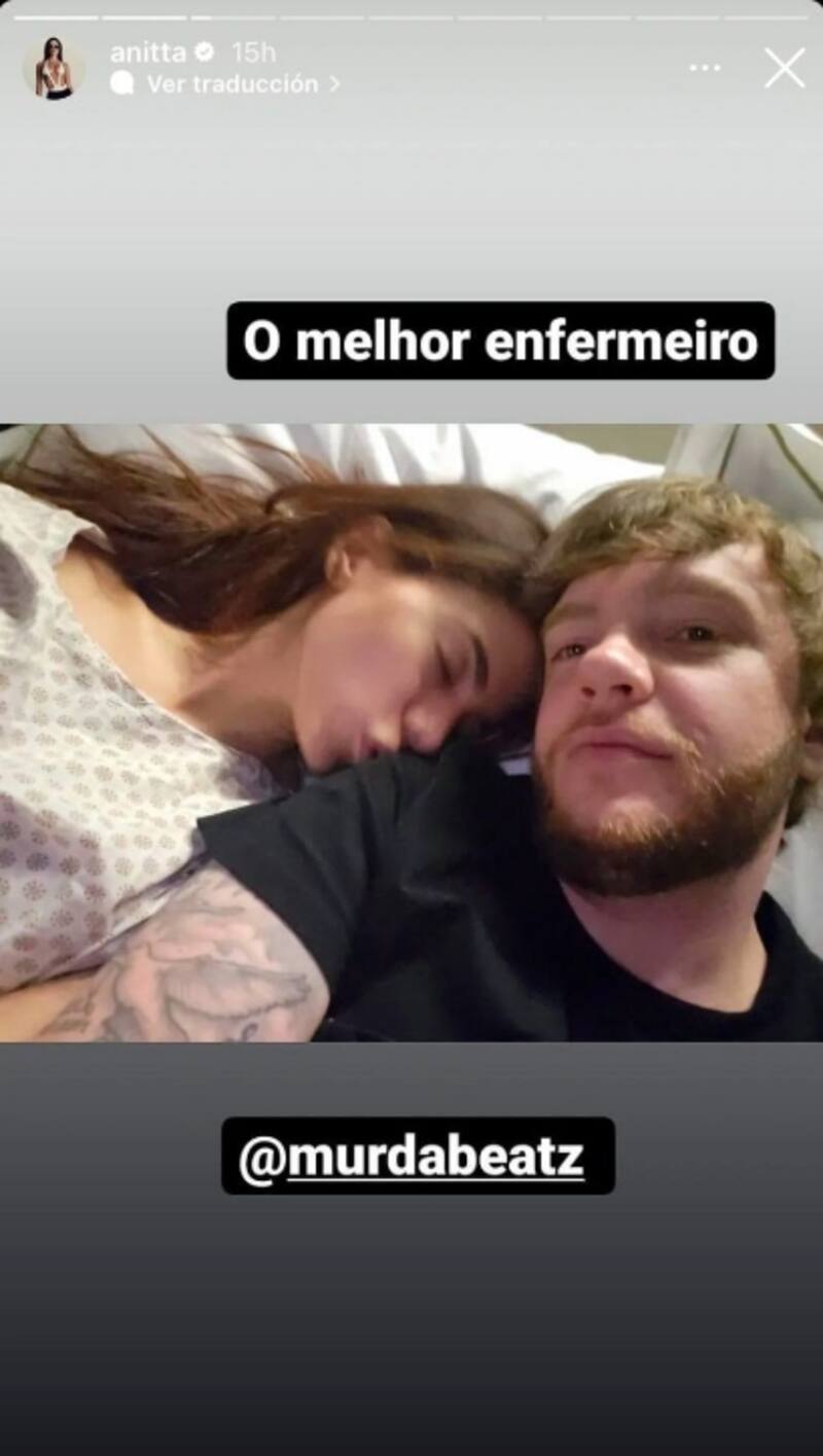 "El mejor enfermero" escribió Anitta en portugués sobre la fotografía publicada en las historias de su cuenta de Instagram con más de 63 millones de seguidores. Podemos verla recostada en la cama junto a su novio, Murda Beatz mientras la intérprete de "Envolver" le da un beso en el hombro. Anitta hizo pública su relación con el productor musical canadiense hace un poco más de un mes en el Día del Amor en Brasil.