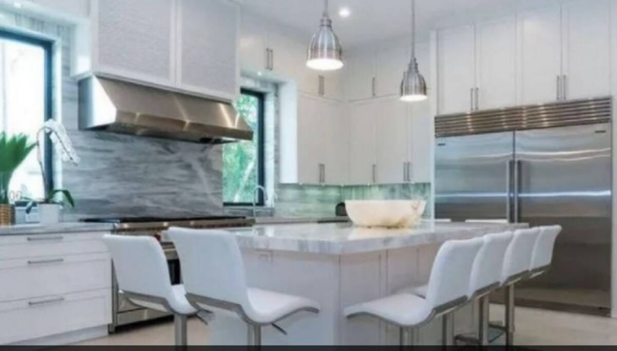 Uno de los espacios que más llama la atención es la cocina gourmet en color blanco, que tiene una espectacular isla con tapa de mármol y electrodomésticos de última categoría, todos en acero inoxidable. Los espacios de guardado están diseñados para que no sean notorios a simple vista.