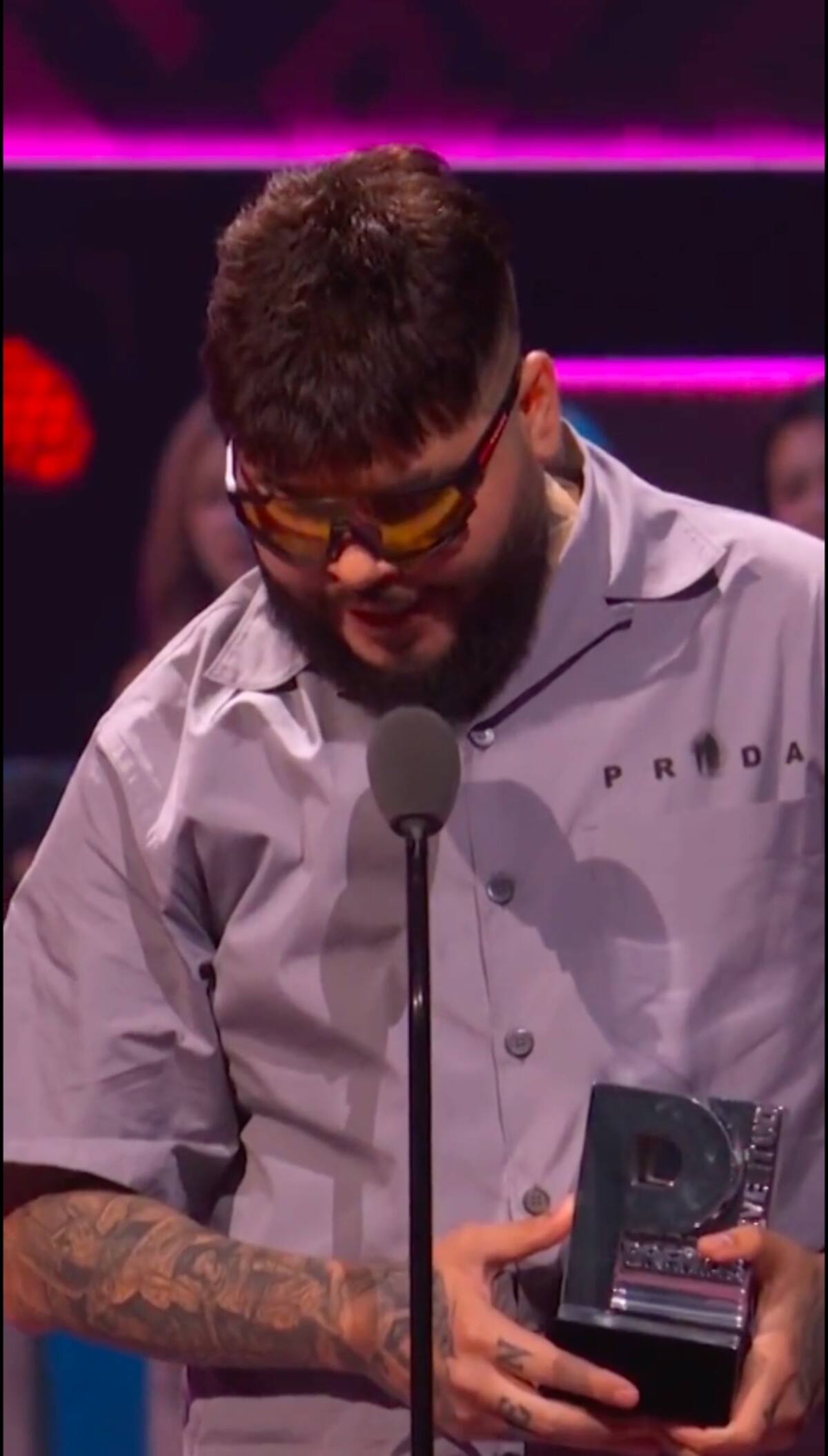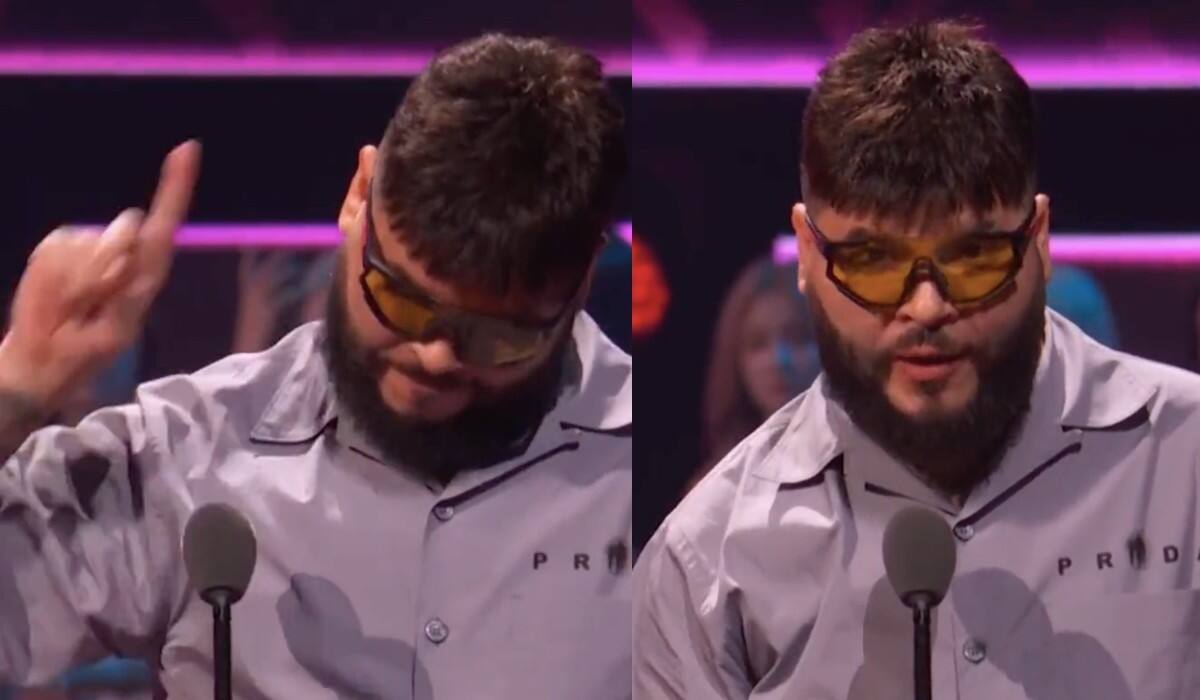 Llegando frente al micrófono y después de recibir la estatuilla, negaba con el dedo índice y señalaba al cielo mientras lo ovacionaban con aplausos y gritos. Aprovechó para mandar un mensaje a todos sus seguidores.