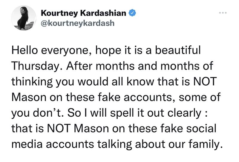 A través de Twitter Kourtney Kardashian aclaró los rumores revelando que dichas cuentas no pertenecían a su hijo: "Hola a todos, espero que tengan un hermoso jueves. Después de meses y meses de pensar que ustedes ya sabrían que no es Mason el de esas cuentas falsas, alguno de usted todavía no lo sabes. Así que déjenme dejárselos claro: Ese NO es Mason en todas esas cuentas falsas hablando sobre mi familia".