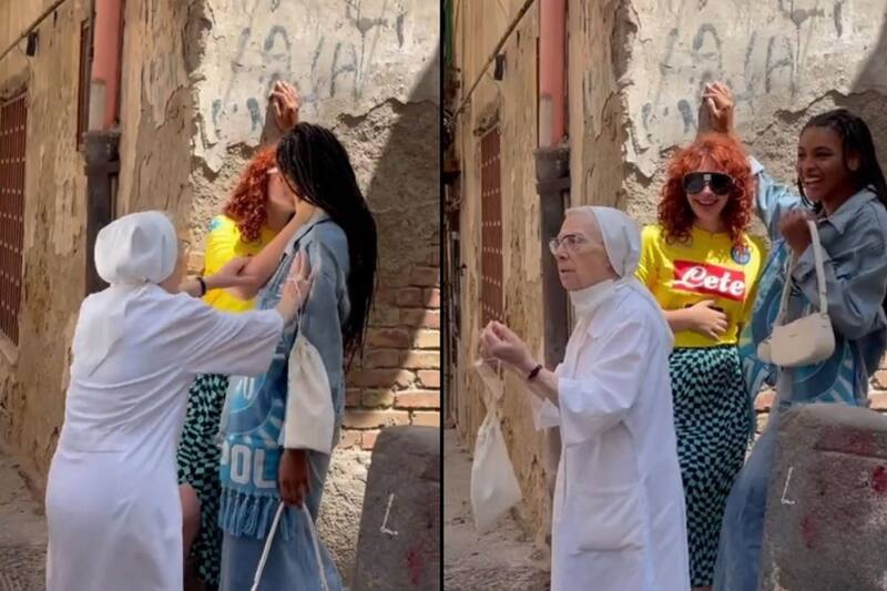 En redes sociales se ha hecho viral un video que muestra el momento en el que una monja separa a dos mujeres que se estaban besando en un calle de la ciudad italiana de Nápoles.