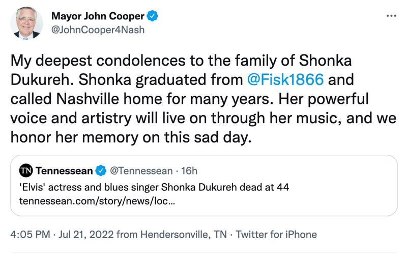 El alcalde de Nashville lamentó la noticia a través de sus redes sociales escribiendo que “su poderosa voz y su talento vivirán a través de su música y haremos honor a su memoria en este día tan triste”.
