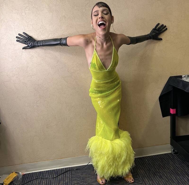 La cantante se dejó ver en la alfombra roja de los premios con un look en color amarillo neón de tela delgada, tanto así que se podía verse su lencería. Sin embargo, de los aspectos que más llamaron la atención fue que en lugar de sostén uso unas cintas en forma de tache sobre sus pechos.
