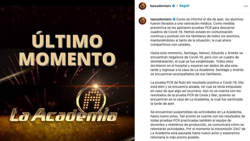 De acuerdo con el comunicado, las actividades en 'La academia' están suspendidas hasta nuevo aviso. "Tan pronto se cuente con los resultados de todas pruebas PCR practicadas también al equipo de docentes y miembros de producción, se comunicará cómo se retomarán actividades. Por el momento la transmisión 24x7 de La Academia está pausada hasta nuevo aviso y esperamos retomarla lo más pronto posible".