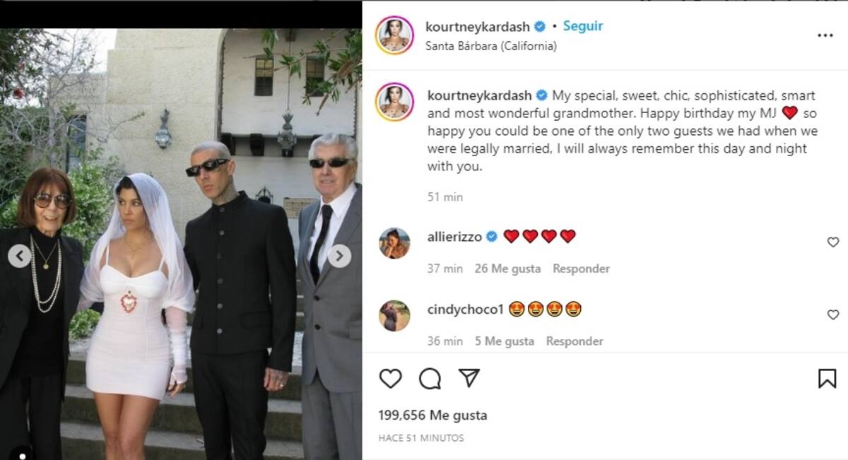 "Mi abuela especial, dulce, elegante, sofisticada, inteligente y maravillosa", comenzó diciendo Kourtney Kardashian, quien agregó: "Feliz cumpleaños mi MJ. Muy feliz de que pudieras ser uno de los dos únicos invitados que tuvimos cuando fuimos legalmente casados, siempre recordaré este día y noche contigo".