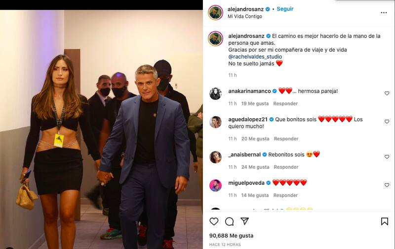El mensaje acompañó a una imagen en la que el cantante y la artista de 32 años aparecen caminando tomados de la mano. En una entrevista, Rachel había contado sobre Sanz: