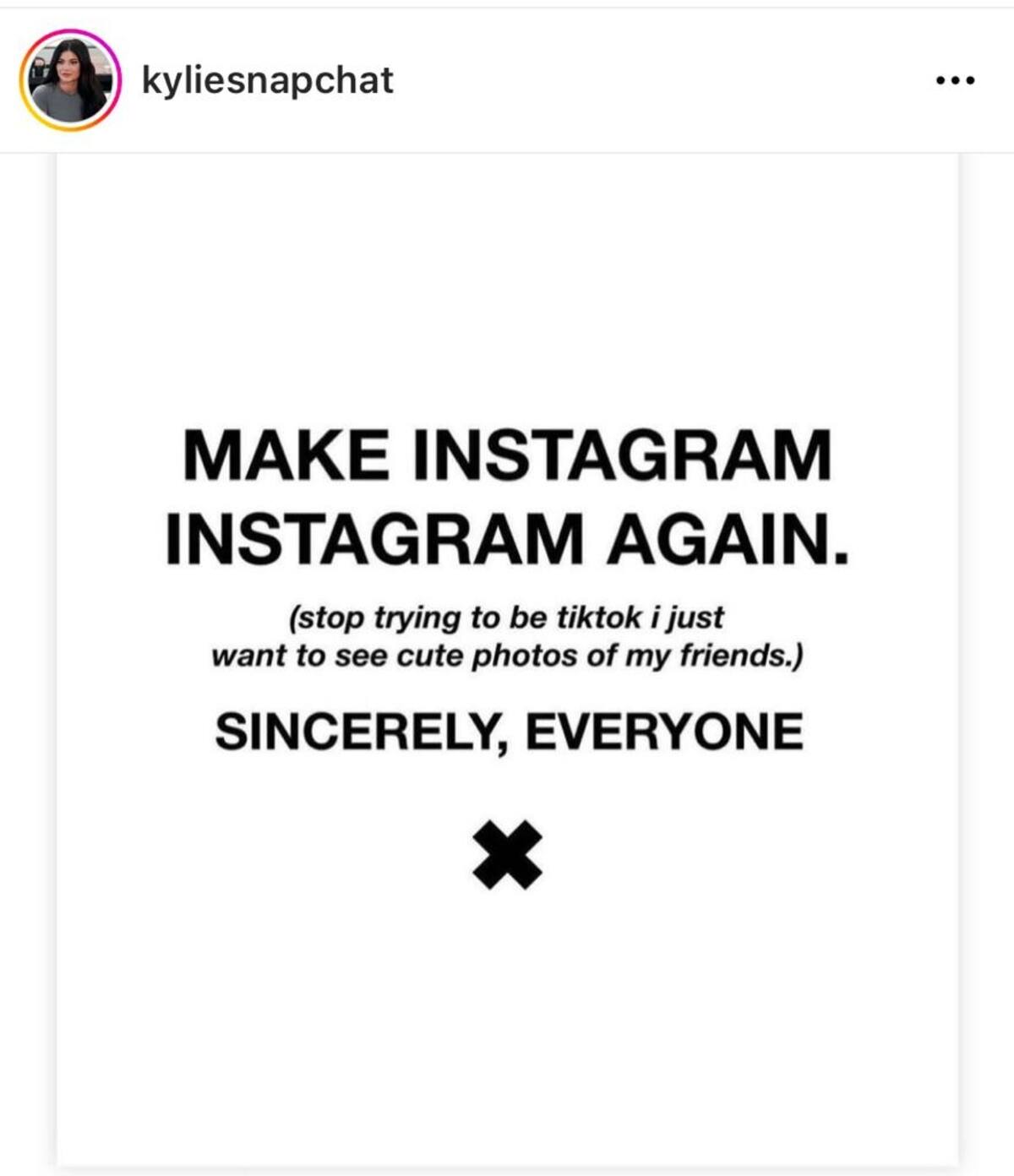 Kylie Jenner y Kim Kardashian se mostraron inconformes con los cambios que anunció Instagram. Las socialités piden que la red social vuelva a enfocarse en fotografías y deje de lucir como Tiktok, pues al aparecer quieren seguir compartiendo sus fotografías de varios aspectos de su vida social.