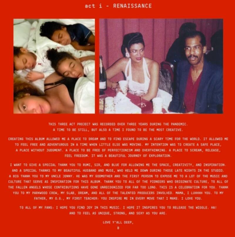 Beyoncé dedicó "Renaissance" a sus fans: "Espero que encuentren alegría en esta música. Espero que los inspire a dejar el meneo. Ja. Y que se sientan únicos, fuertes y sexys como lo son. Los quiero mucho, B".