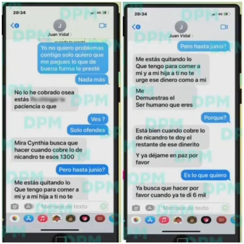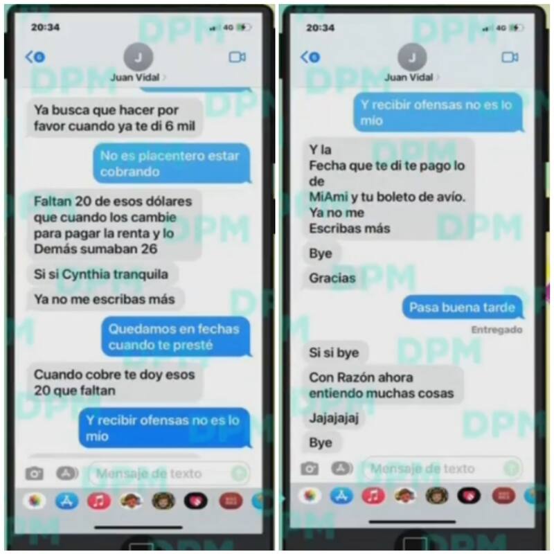En las capturas de pantalla, se puede leer que Cynthia pretendía cobrar de buena manera lo que le prestó a Juan, pero en uno de los supuestos mensajes que él le envió se lee: "No lo he cobrado, o sea, estás para chi#%$* la paciencia o qué". A lo que la actriz le respondió: "¿Ves? Solo ofendes".