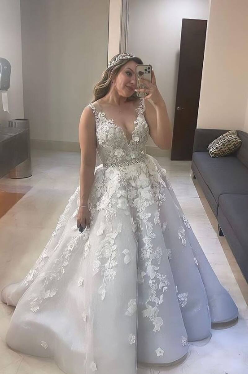 La guapa novia lució un tradicional vestido blanco de corte princesa con escote en v y varias aplicaciones en pedrería. El diseño de esta pieza estuvo a cargo de la casa Narciza Severa de Saúl Tello.