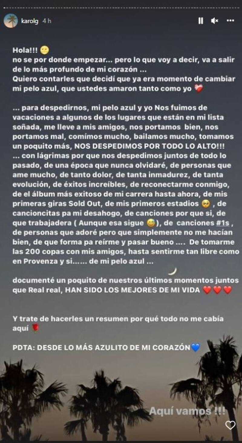 "Decidí que ya era momento de cambiar mi pelo azul, que ustedes amaron tanto como yo. Para despedirnos mi pelo azul y yo nos fuimos de vacaciones a algunos de los lugares que están en mi lista soñada, me llevé a mis amigos, nos portamos bien, nos portamos mal, comimos mucho, bailamos mucho, tomamos un poquito más. ", escribió al inicio del extenso mensaje.