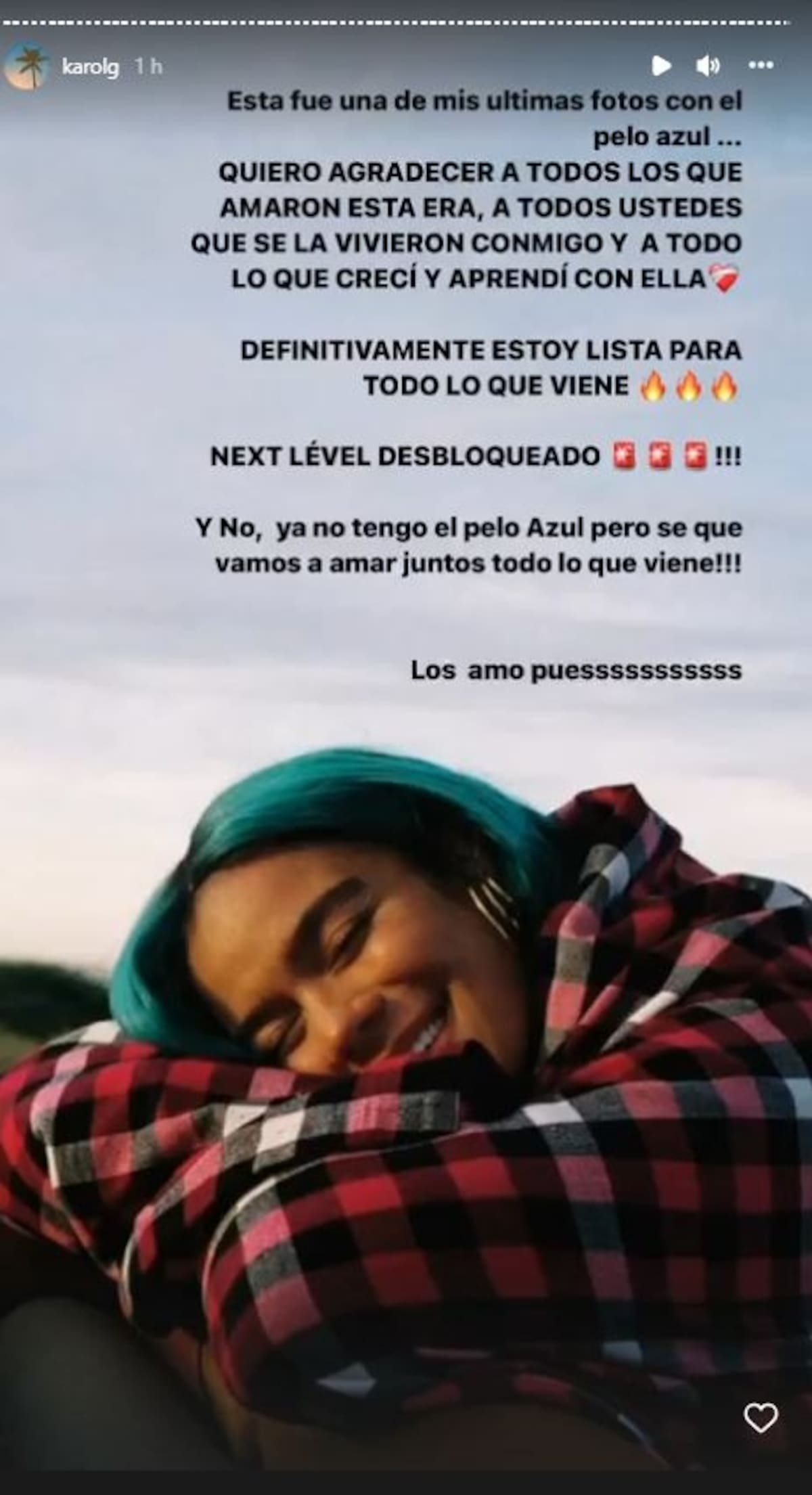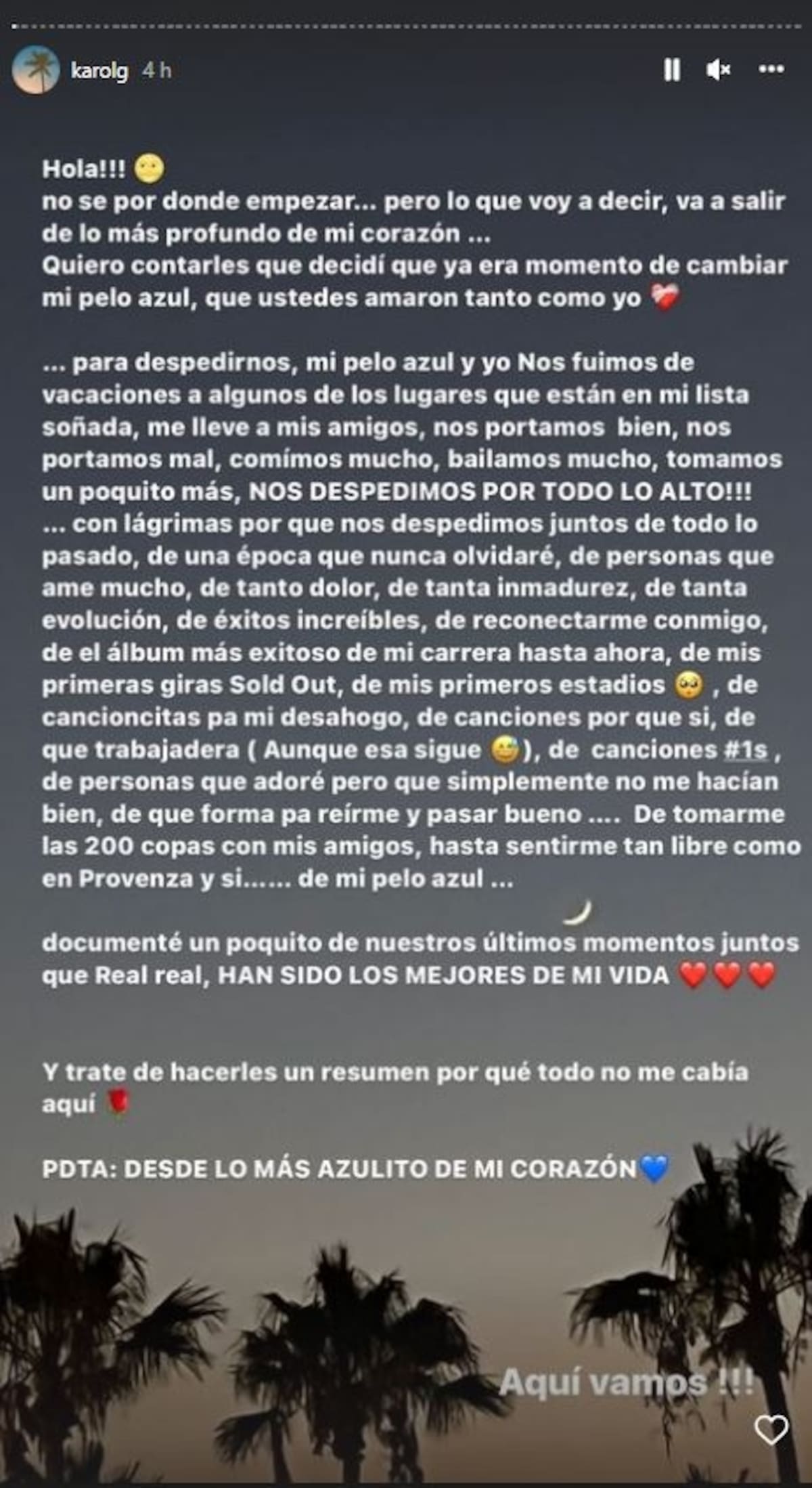 "Decidí que ya era momento de cambiar mi pelo azul, que ustedes amaron tanto como yo. Para despedirnos mi pelo azul y yo nos fuimos de vacaciones a algunos de los lugares que están en mi lista soñada, me llevé a mis amigos, nos portamos bien, nos portamos mal, comimos mucho, bailamos mucho, tomamos un poquito más. ", escribió al inicio del extenso mensaje.