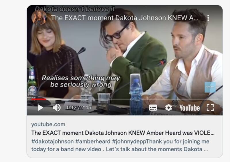 Se les ve intercambiar unas palabras inaudibles que hacen reír a Johnson. Pero segundos después, el semblante de ella cambia. Algunos internautas interpretaron, siete años después del video, que Dakota sospechaba que había algo más detrás de la lesión. El título del video vuelto viral durante el juicio fue "The EXACT moment Dakota Johnson KNEW Amber Heard was VIOLENT towards Johnny Depp.”