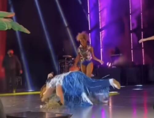 A través de sus redes sociales la intérprete de "Pelo suelto" compartió un clip en el que muestra como subió a uno de sus fans al escenario para bailar junto con ella, pero al saludarse ambos de una efusiva manera el peso de ambos los hace tambalear en el escenario hasta caer, ambos al piso, quedando la artista abajo del joven.