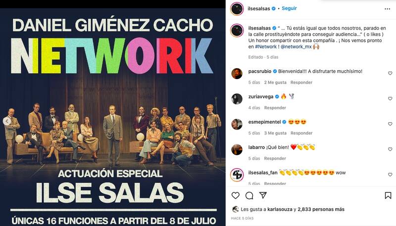 Ilse Salas se encuentra muy activa. Hace apenas un par de meses la vimos en la serie "Señorita 89" de Starz, y ahora estará en la obra "Network", que se presenta en el Teatro de los Insurgentes de Ciudad de México, además de que participó en la película "Maquíllame otra vez" que se filmó en la misma ciudad en mayo con un elenco que incluyó a Paulina Gaitán y Regina Blandón.