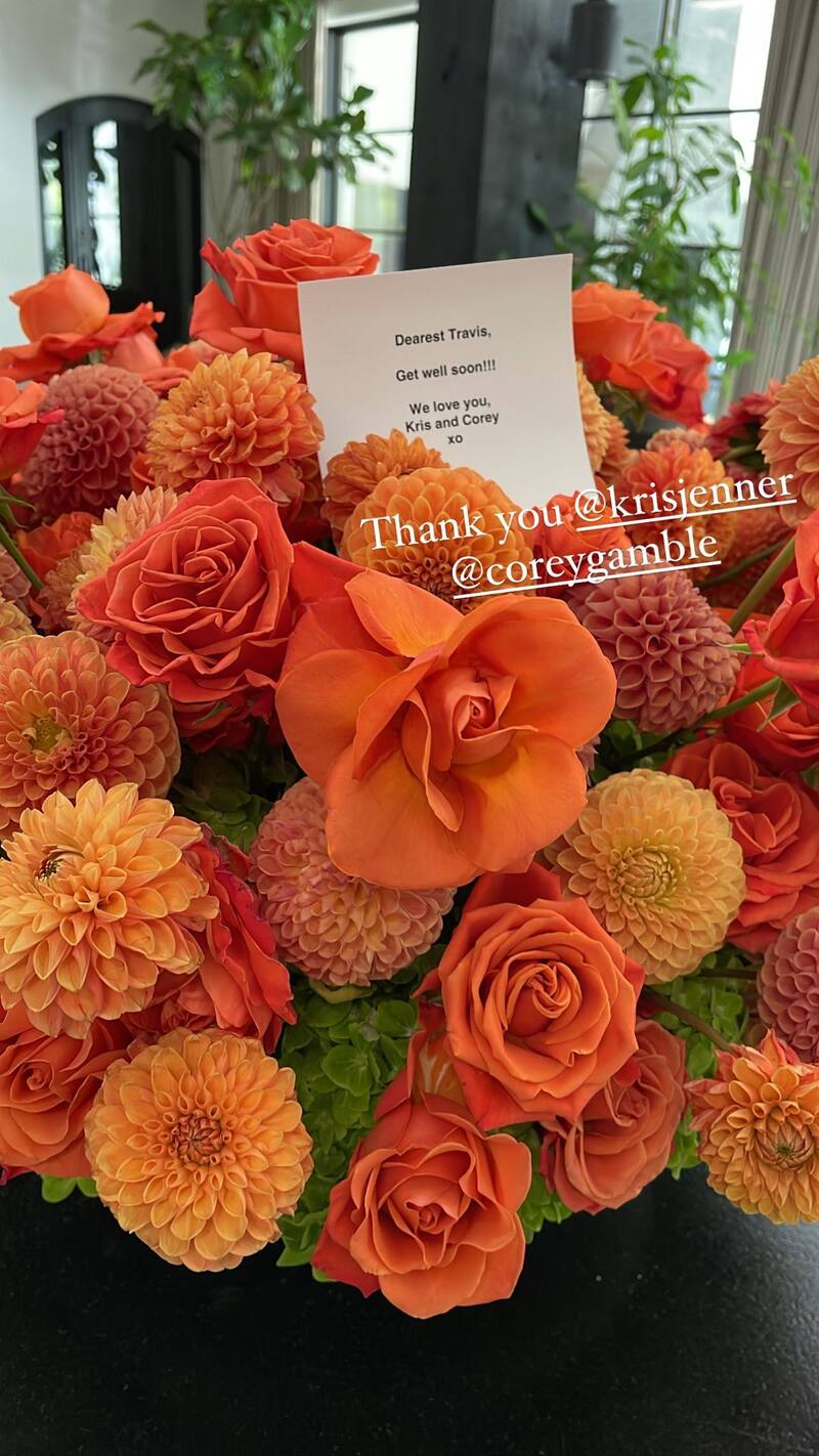 La emergencia ya pasó y Travis Barker está de regreso en casa. En ella lo esperaba un bonito gesto de su nueva suegra, Kris Jenner. Este lunes, la matriarca del clan Kardashian optó por regalarle un increíble ramo de flores naranja. "Querido Travis, ¡Recupérate pronto! Los amamos, Kris y Corey xo", se podía leer en la tarjeta que acompañaba el arreglo.