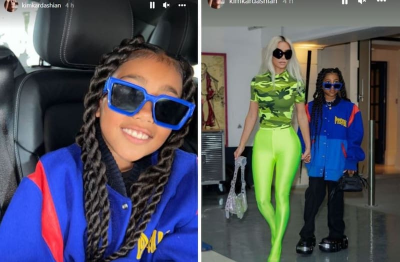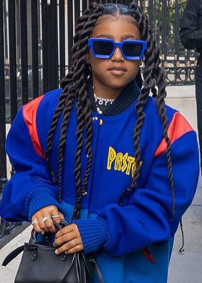 En tanto, la pequeña de 9 años, hija de Kanye West pareciera que hizo una oda a su padre con el estilo que eligió par viajar a París y es que en esta ocasión, la niña utilizó unos pantalones holgados en color negro, una chamarra tipo bomber en color azul de la marca de ropa Pastelle de su padre y unos zapatos negros tipo crocs con plataforma con elementos plateados Balenciaga, lentes de pasta en color azul Louis Vuitton , bolsa negra, y sus características trenzas por todo el cabello.