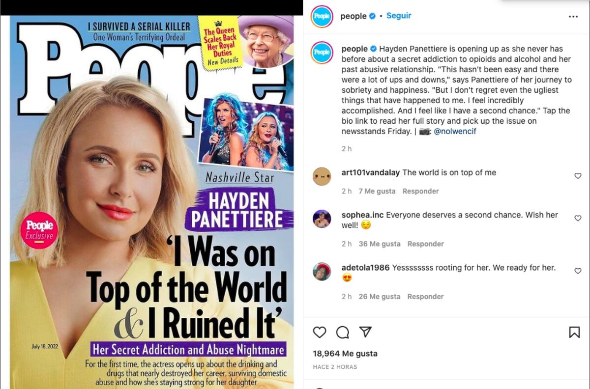 Hayden Panettiere es portada de la nueva edición de la revista "People", para la cual habló por primera vez de su adicción a los opiáceos y el alcohol, además del abuso doméstico que sufrió. "Estaba en la cima del mundo y lo arruiné", dijo en la entrevista la actriz que a los 17 años era ya una estrella mundial, hecho que se afianzó por su personaje de Claire Bennet en la serie "Heroes" (2006).