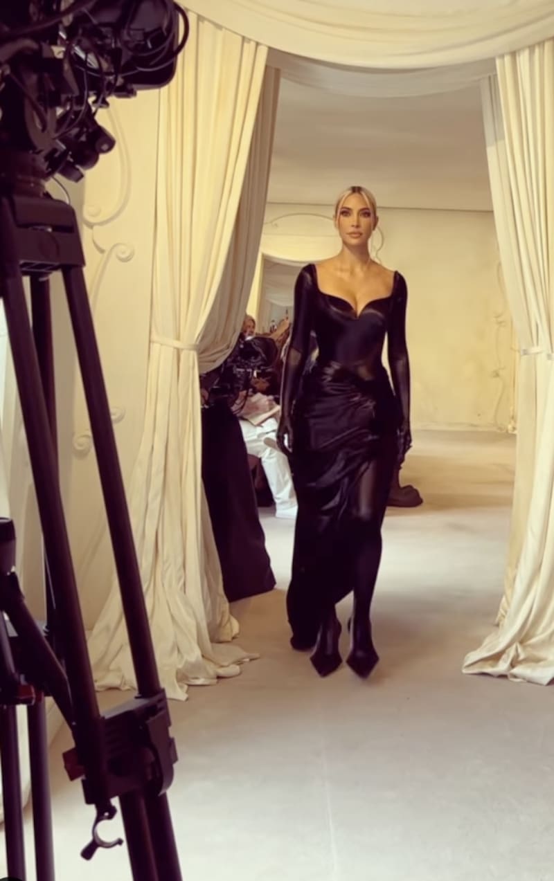 La primera estrella en salir a la pasarela fue la dueña de SKIMS, la cual modeló un vestido largo con espalda escotada, botas por encima de la rodilla y lució su cabellera rubia en una cola de caballo.