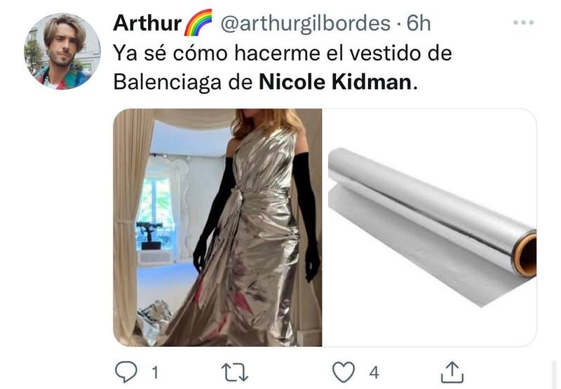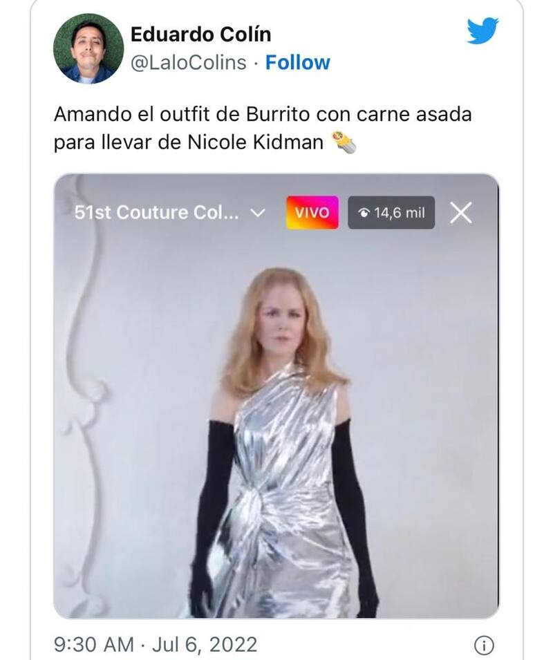 Kidman lució un vestido largo plateado brillante recogido del hombro y acinturado, acompañado de guantes largos negros, zapatilla y medias negras, pero la hasta ahí todo bien; sin embargo, la tela con la que fue hecha la prenda tenía un gran parecido con el papel aluminio, lo que generó los comentarios en internet.