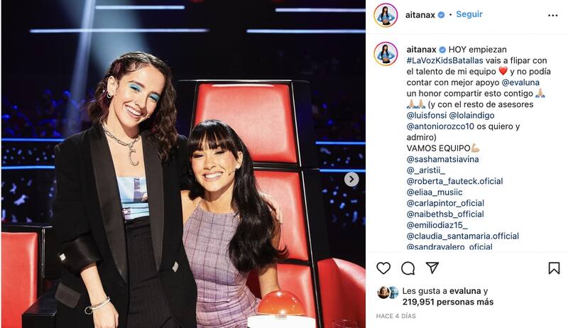 La artista apareció en el reconocido programa "La Voz Kids" de España. Su participación causó sensación al lado de Aitana: "Hoy empiezan #LaVozKidsBatallas, vais a flipar con el talento de mi equipo y no podía contar con mejor apoyo: @evaluna, un honor compartir esto contigo", aseguró la cantante española en sus redes sociales en la que se le ve con Evaluna abrazadas y felices por compartir esta nueva etapa del programa.