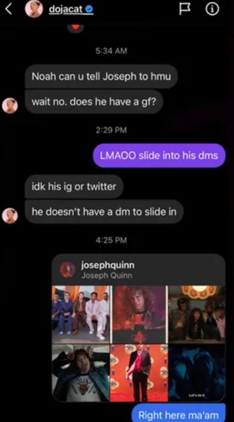 "Noah, ¿puedes decirle a Joseph que me hable? Espera, no. ¿Tiene novia?", escribió Doja Cat a través de mensaje directo de Instagram. Noah Schnapp no queriendo involucrarse directamente en sus asuntos solo le dijo que ella le hablara por "dm".