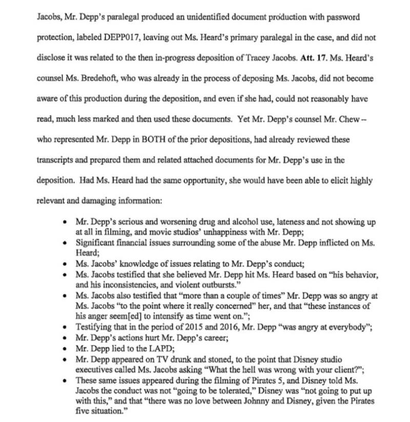 También se excluyó la afirmación de que el "Sr. Depp apareció en la televisión borracho y drogado, hasta el punto de que los ejecutivos de los estudios de Disney llamaron a la Sra. Jacobs para preguntarle qué diablos le pasaba a su cliente", algo que fue considerado como "información relevante y dañina".