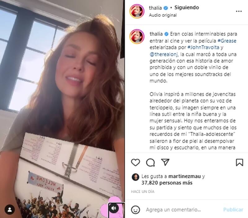 En el siguiente video, Thalía compartió uno de sus momentos más felices, cuando fue enviado por su amiga en donde Olivia Newton John las sube a cantar Summer Nights, mientras que también recordó una entrevista donde recalca que fue a ver la obra de Vaselina porque se consideraba una gran fanática de dicha producción.