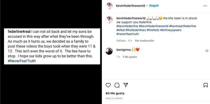 Aunque el primero en hablar fue el propio Federline, en una entrevista con Daphne Barak para Daily Mail, Britney Spears decidió no guardar silencio y primero subió un comunicado a su cuenta de Instagram el fin de semana y el miércoles subió otro para hablar de la relación con sus hijos.