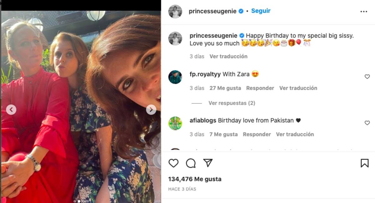 La hija menor del príncipe Andrew y Sarah Ferguson compartió una galería de imágenes con su hermana, en la que incluyó una selfie con su prima, Zara Tindall, la jinete olímpica hija de la princesa Ana.