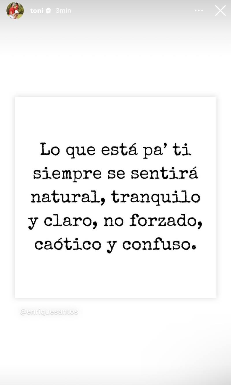 Luego de que los seguidores de la conductora de "Hoy día" comentaran su publicación especulando que se trataba de una fuerte indirecta, Toni Costa decidió contestar a su manera. "Lo que está pa' ti siempre se sentirá natural, tranquilo y claro, no forzado, caótico y confuso", se lee en el mensaje.