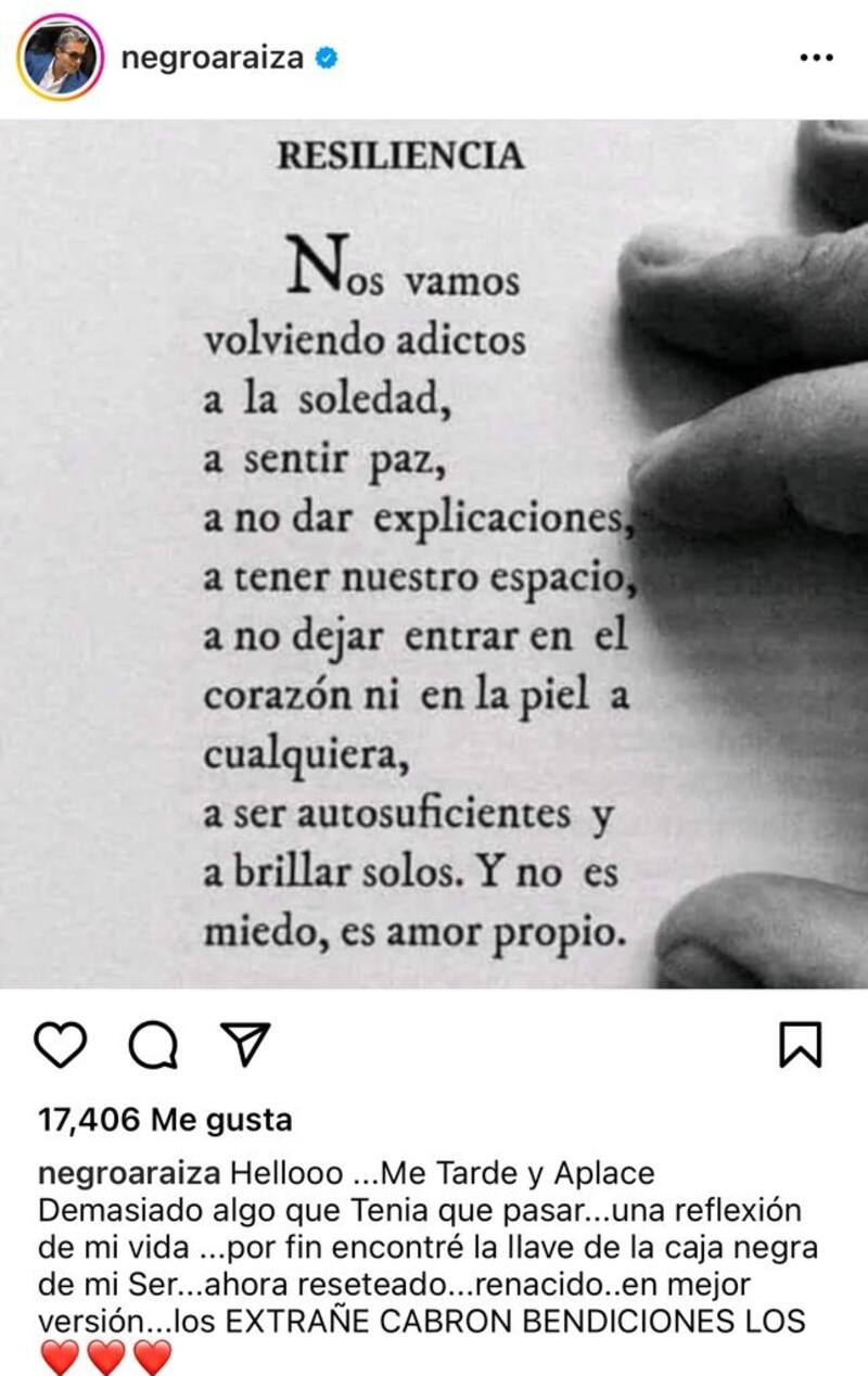 "Nos vamos volviendo adictos a la soledad, a sentir paz, a no dar explicaciones, a tener nuestro espacio, a no dejar entrar en el corazón, ni en la piel a cualquiera, a ser autosuficientes y a brillar solos. Y no es miedo, es amor propio", se lee en la misteriosa imagen que subió Raúl Araiza en su red social.