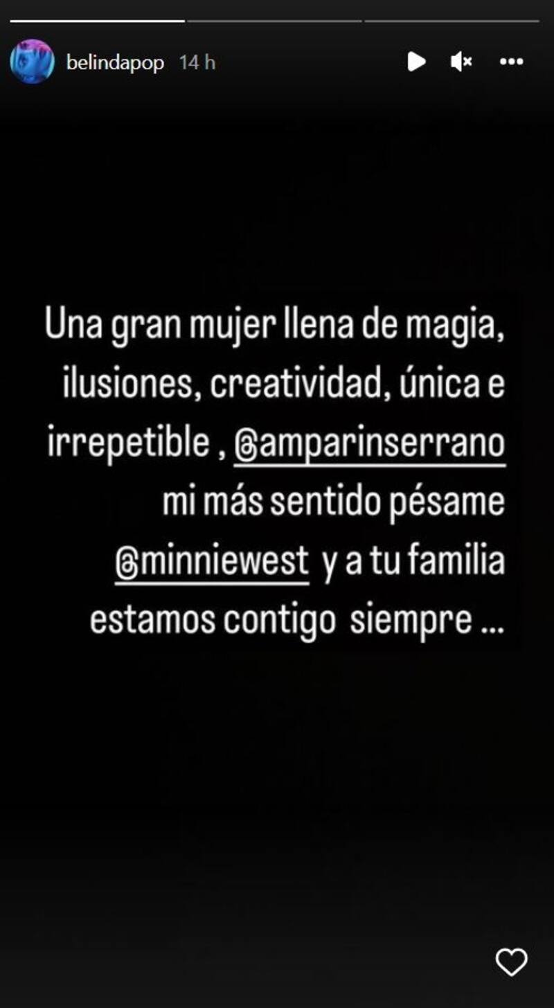 "Una mujer llena de magia, ilusiones, creatividad, única e irrepetible, Amparín Serrano. Mi más sentido pésame, Minnie West y a tu familia, estamos contigo siempre", agregó en otro mensaje en el que utilizó uno de los famosos diseños de la creativa con los que consolidó su marca.