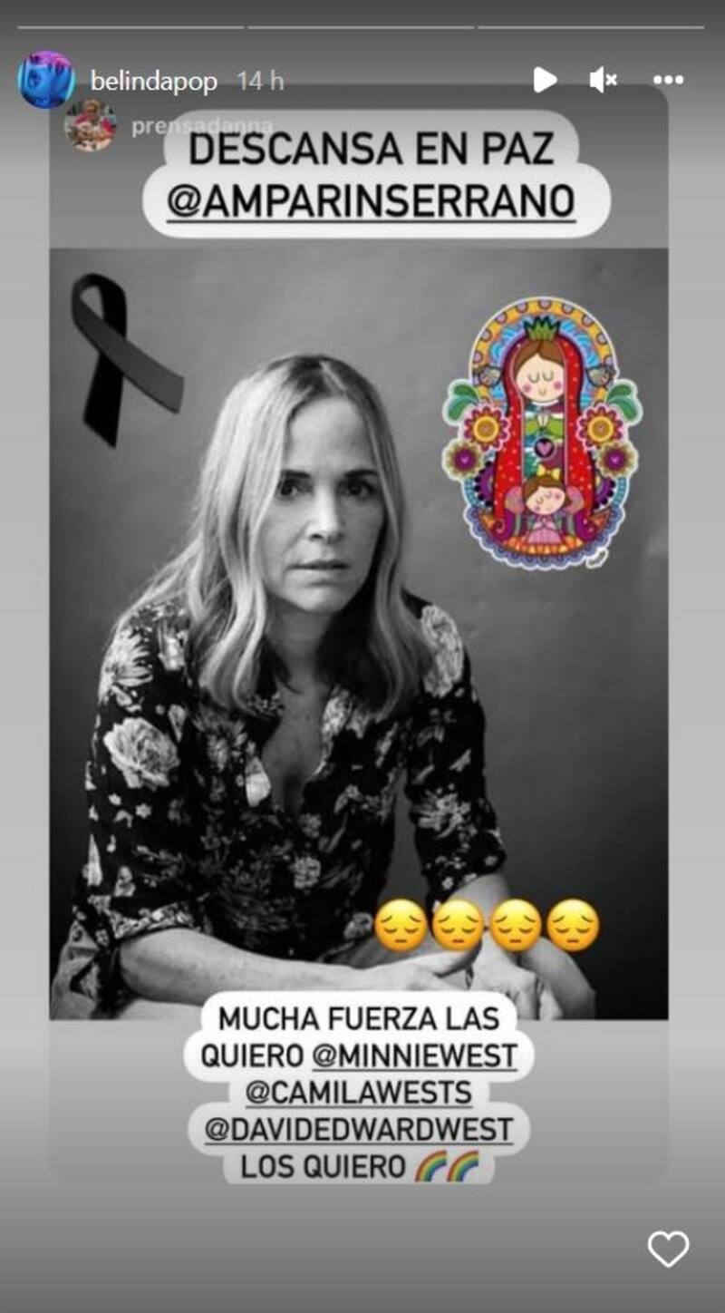 De acuerdo con la revista TV Notas, Belinda y su familia son muy cercanas de Amparín Serrano debido a que su hermano, Ignacio Peregrín, es la actual pareja de Minnie West, una de las hijas de la fallecida.
