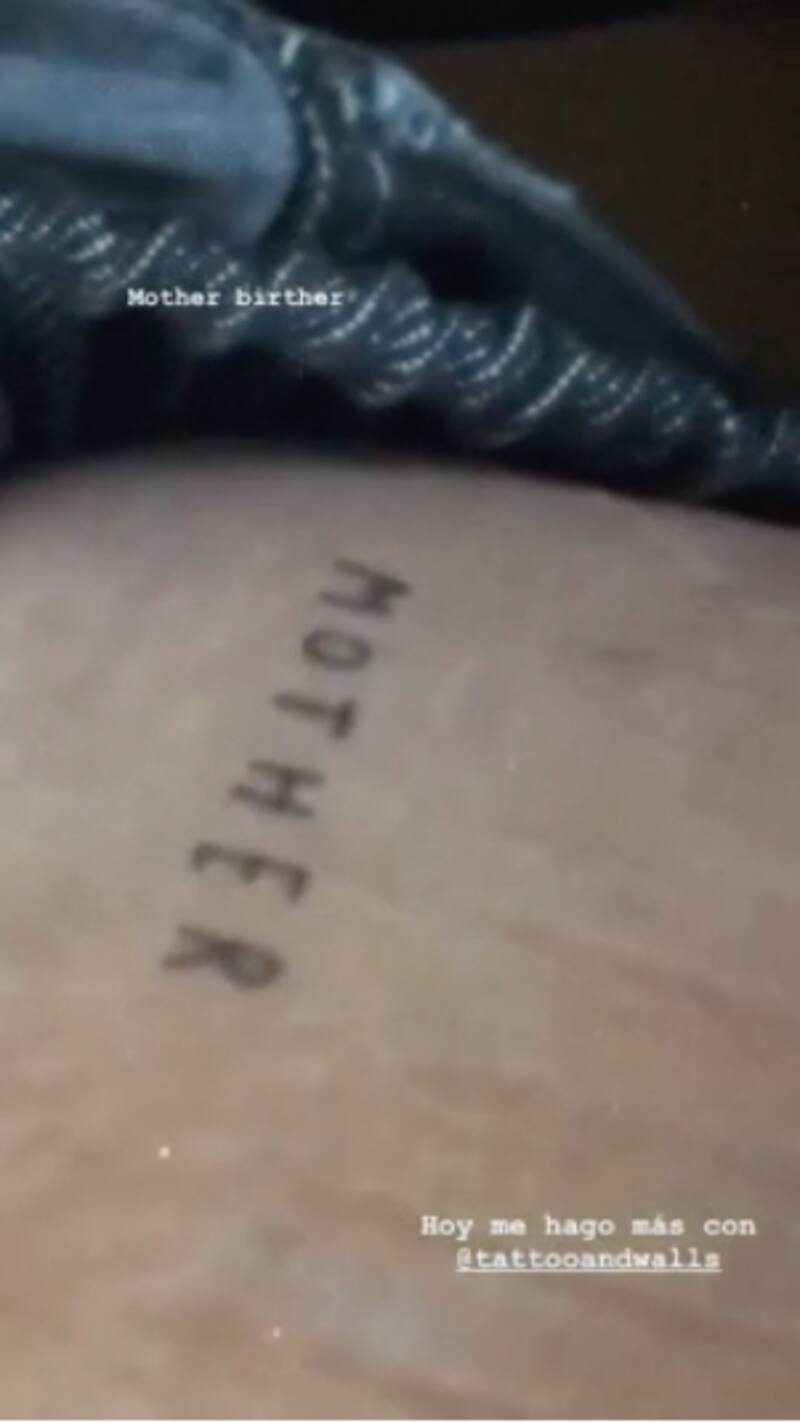 La artista publicó un video del tatuaje con profundo significado. Se encuentra en su vientre y tiene la palabra "Mother" en tinta negra. Es un clip muy corto pero con gran significado de la marca que le recordará por siempre el sentimiento de convertirse en mamá de su pequeña hija Índigo.