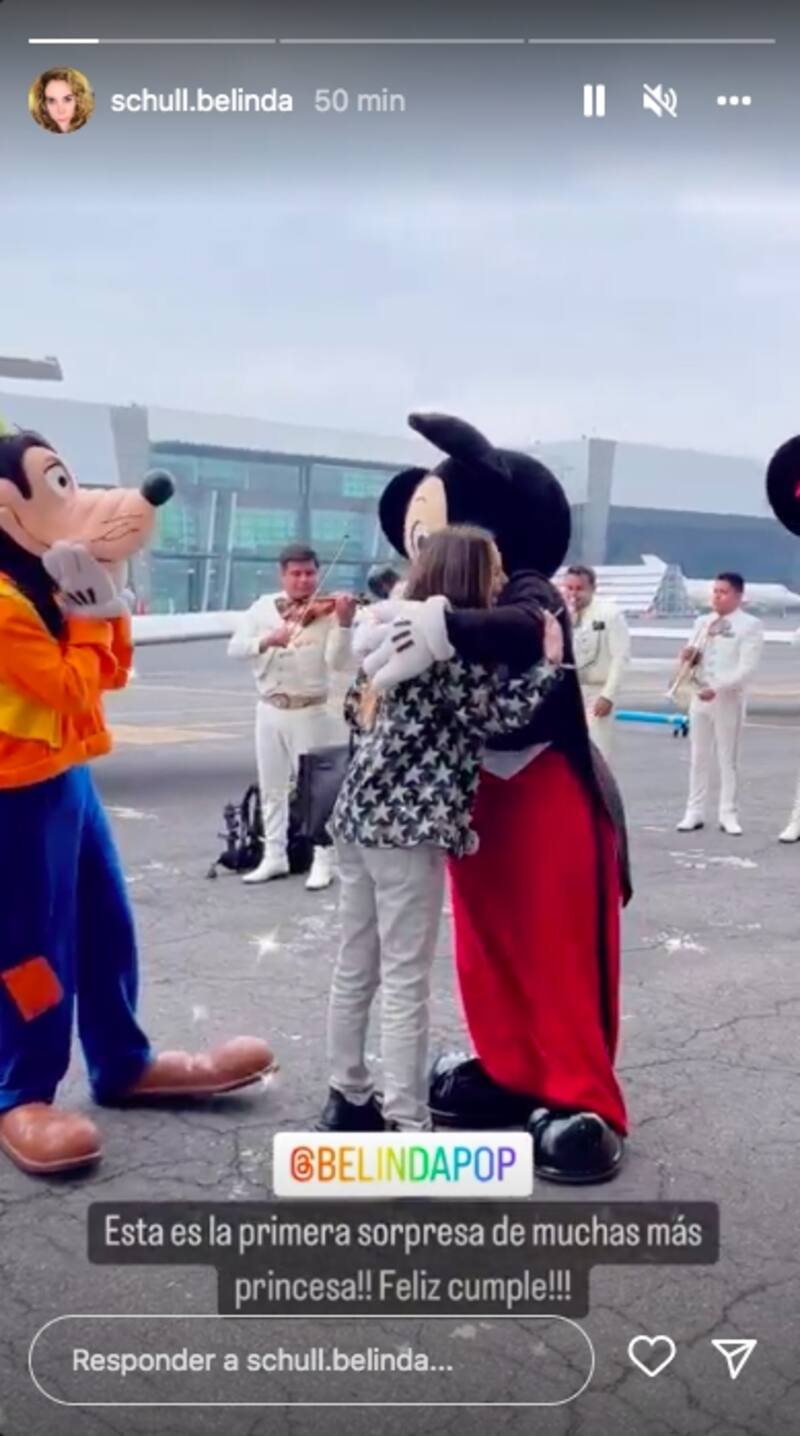 Belinda está cumpliendo 33 años y decidió celebrarlo en grande. Al parecer no tiene nada planeado pero su mamá, la señora Belinda Schull, tiene todo un día de sorpresas preparado para su hija. Inició espectacular con una serenata en el aeropuerto acompañada de los principales personajes de Disney.