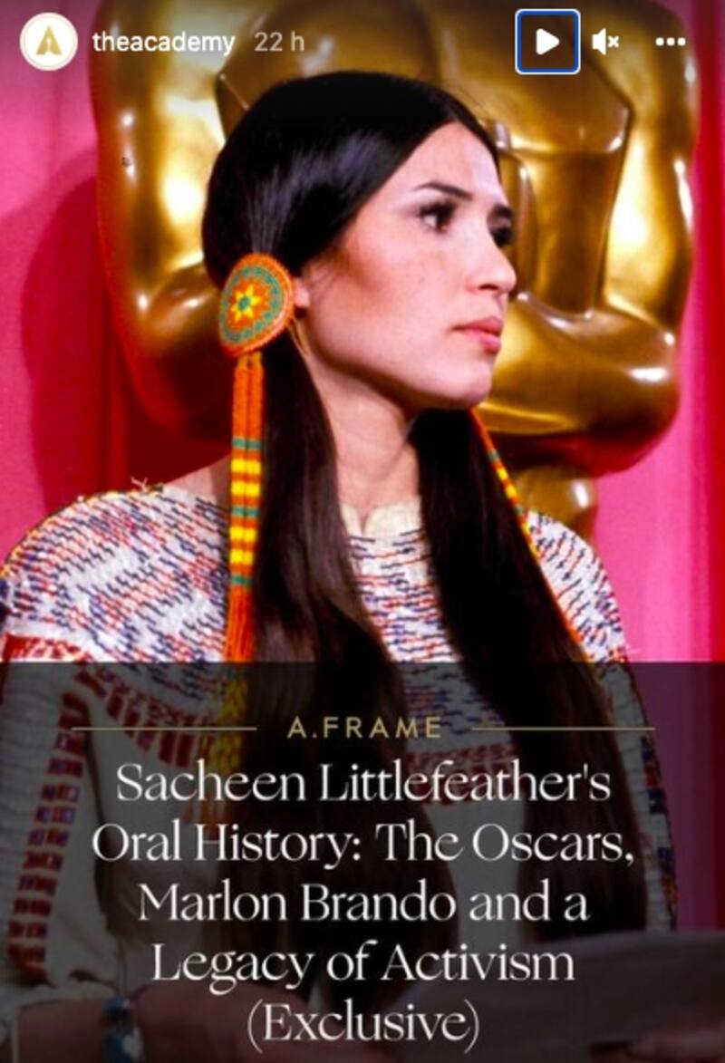La Academia también publicó una larga entrevista con la actriz y activista actualmente de 75 años, para anunciar que Littlefeather ha sido invitada a hablar en el museo de cine en Los Ángeles el próximo mes en un evento llamado "An evening with Sacheen Littlefeather".