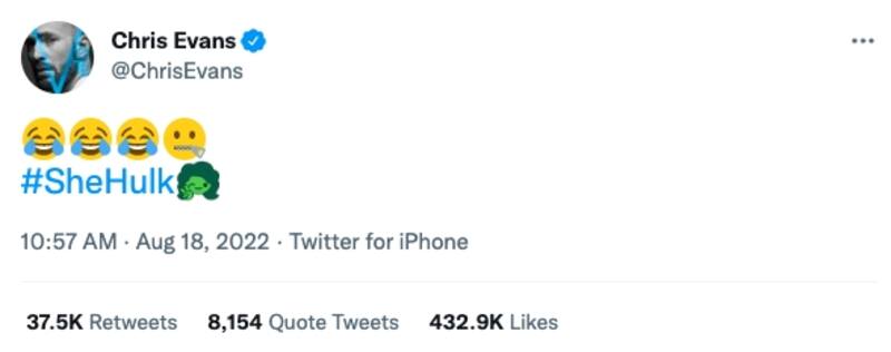 Chris Evans seguramente vio el primer episodio de la nueva serie "She-Hulk: Attorney at Law", pues en su cuenta de Twitter hizo un posteo en el que utilizó emojis de carcajadas y el hashtag que alude a la serie que se puede ver en Disney+.