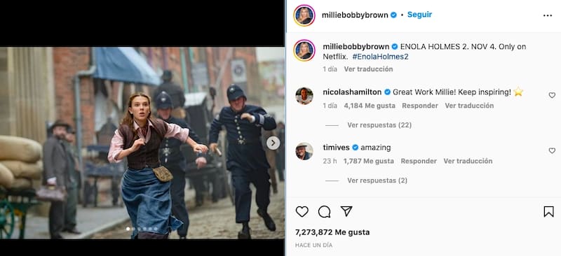 En ellas se ve a la británica, quien se acaba de matricular a la universidad, caracterizada una vez más del personaje que hiciera en la película de 2020. En aquélla, Enola despierta en su cumpleaños 16 solo para notar que su madre ha desaparecido.