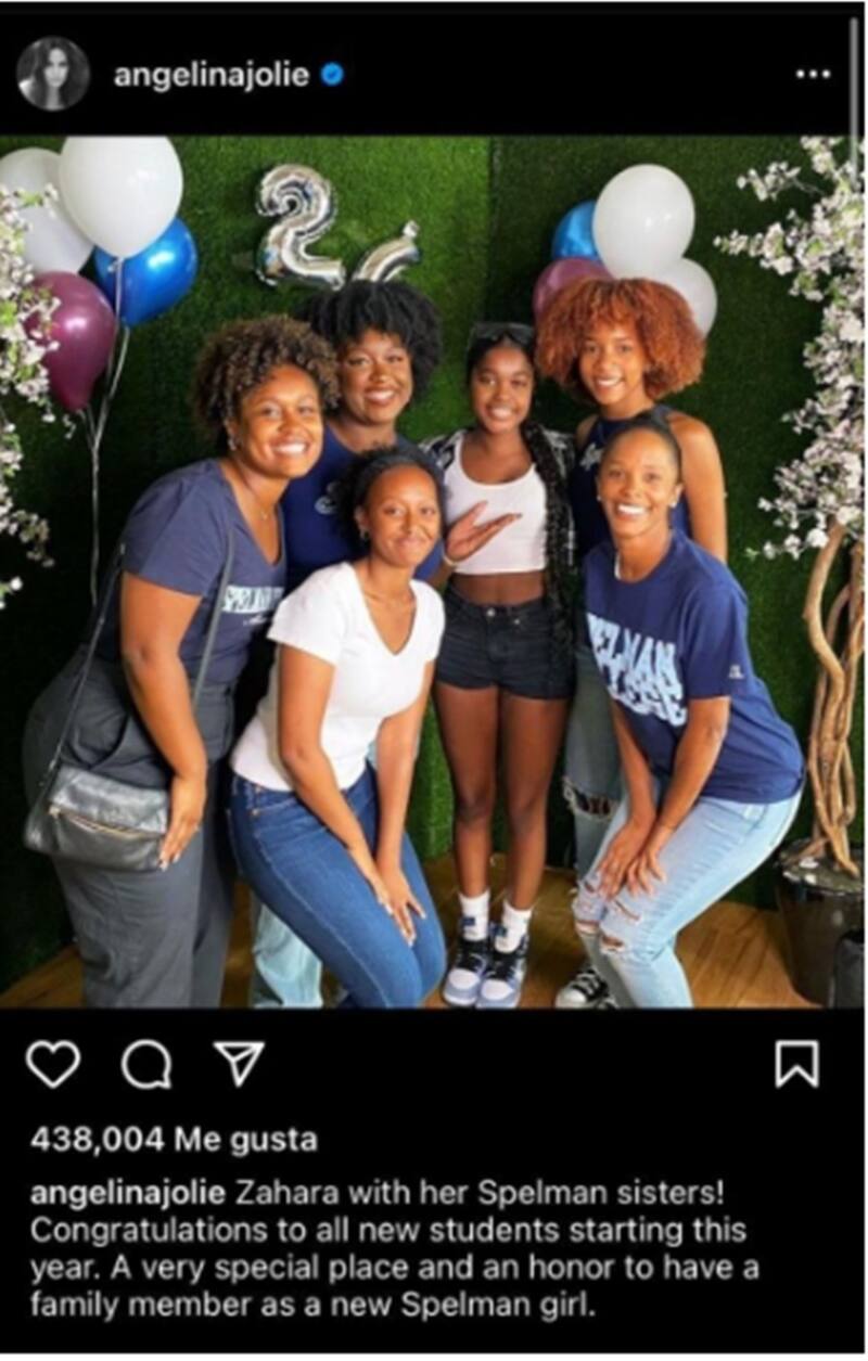 "Zahara con sus hermanas de Spelman. Este es un lugar muy especial y es un honor tener un miembro de la familia que es una nueva chica Spelman. Felicitaciones a todos los nuevos estudiantes que comienzan este año", escribió Angelina Jolie.